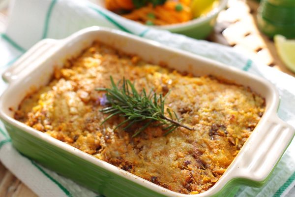A great variation on a traditional cottage pie made with sweet potatoes, lentils onions and tomatoes.